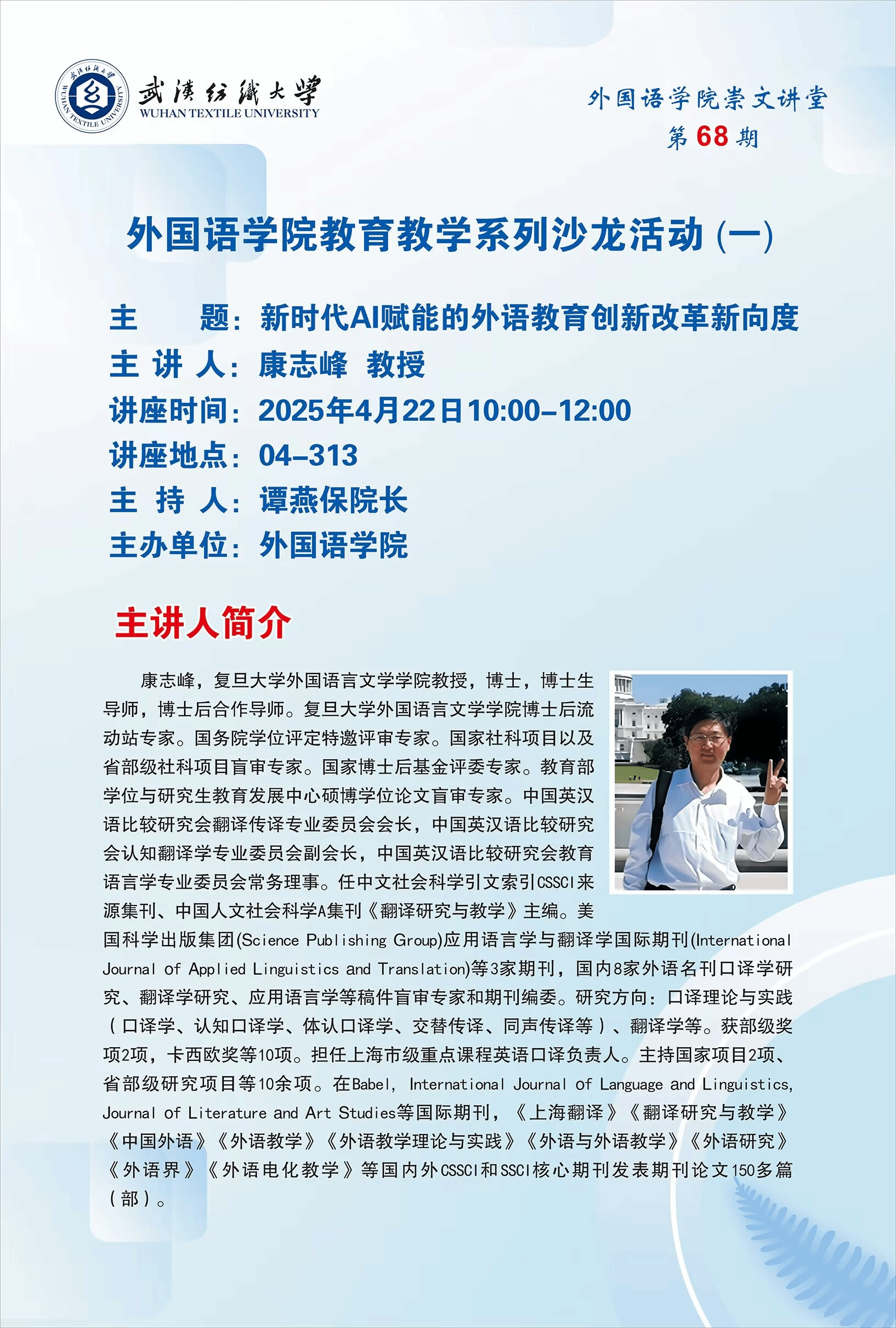4月22日下午,国产乱婬AV片免费特邀复旦大学外国语言文学学院康志峰教授为学院师生在崇文楼313举办主题为《新时代AI赋能的外语教育创新改革新向度》的讲座。科发院院长吕永钢教授和国产乱婬AV片免费师生一同参加讲座。讲座由国产乱婬AV片免费院长谭燕保教授主持。