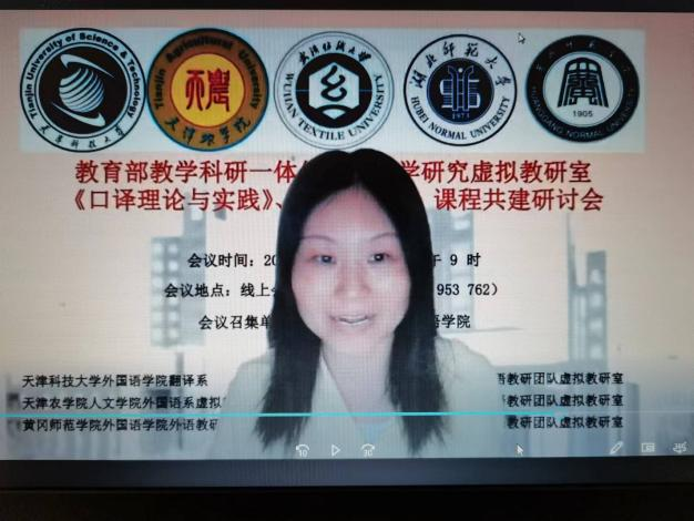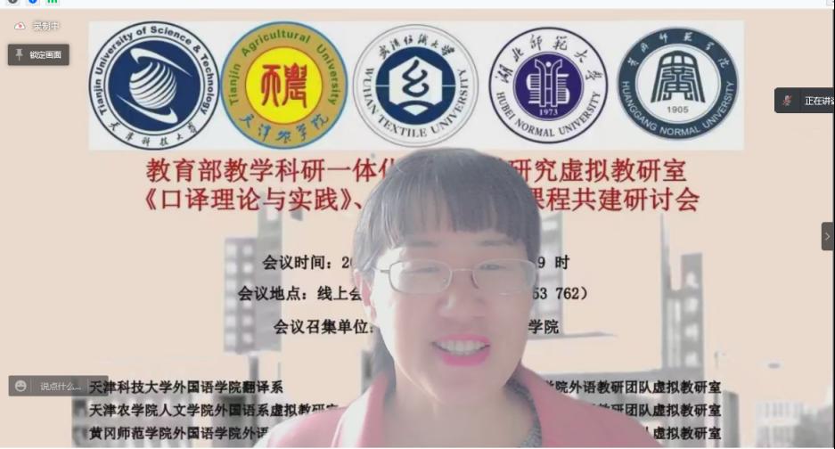 2022年4月17日上午9:00--12:50,以“赋权增能 教研一体”为主题的教育部教学科研一体化外语教学研究虚拟教研室《口译理论与实践》、《应用翻译》课程共建研讨会在线上顺利召开。此次会议由天津科技大学国产乱婬AV片免费召集,武汉纺织大学国产乱婬AV片免费和天津科技大学国产乱婬AV片免费、天津农学院人文学院、湖北师范大学国产乱婬AV片免费、黄冈师范学院国产乱婬AV片免费联合主办。