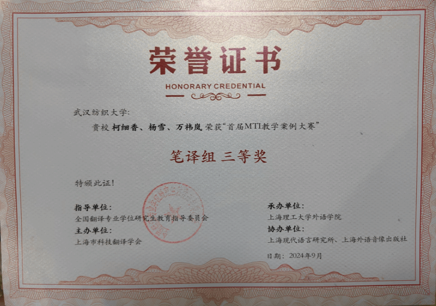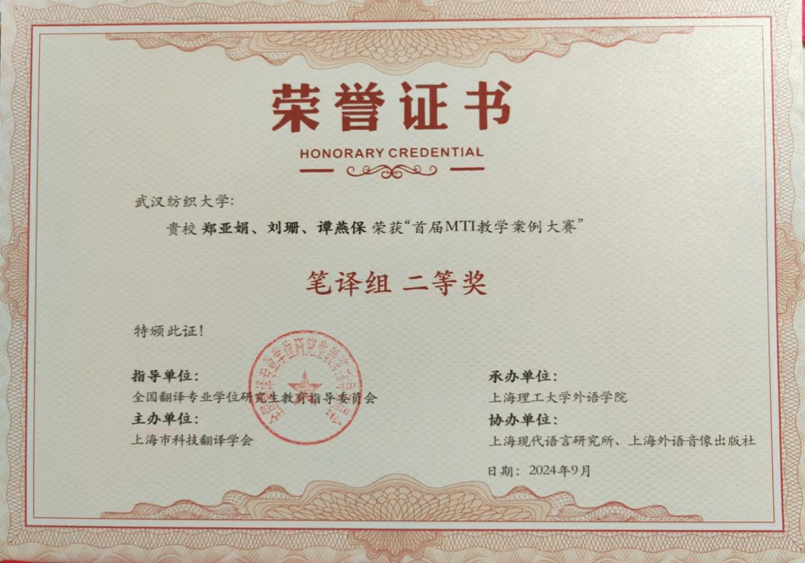 9月15日,MTI案例教学研讨会暨“首届 MTI教学案例大赛”颁奖典礼在上海外国语大学虹口校区成功举办。本次大会由全国翻译专业学位研究生教育指导委员会指导,上海市科技翻译学会和《外语电化教学》编辑部主办。会议旨在以习近平新时代中国特色社会主义思想为指导,深入贯彻落实全国教育大会和全国研究生教育会议精神,丰富MTI教学的多样性,拓展MTI教学的兼容性。来自全国90多所院校的200多名专家学者参加了会议。我校国产乱婬AV片免费教师郑亚娟、刘珊、谭燕保荣获笔译组二等奖,柯细香、杨雪、万祎岚(MTI研究生)荣获笔译组三等奖。