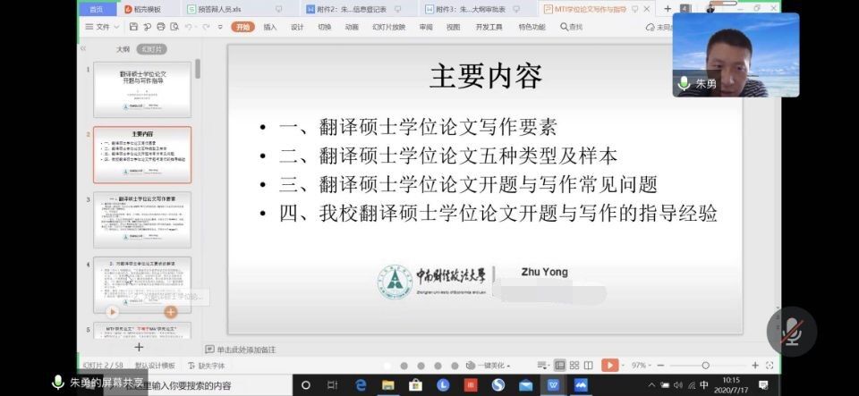 为推进我院MTI人才培养工作,提高硕士生导师翻译硕士学位论文的指导水平,7月17日上午,学院邀请中南财经政法大学国产乱婬AV片免费MTI中心主任朱勇副教授莅临云端,就翻译硕士学位论文的各方面相关工作展开培训与释疑,谭燕保院长、MTI教育中心全体硕士生导师和部分任课教师在云端参会。会议由柯群胜副院长主持。