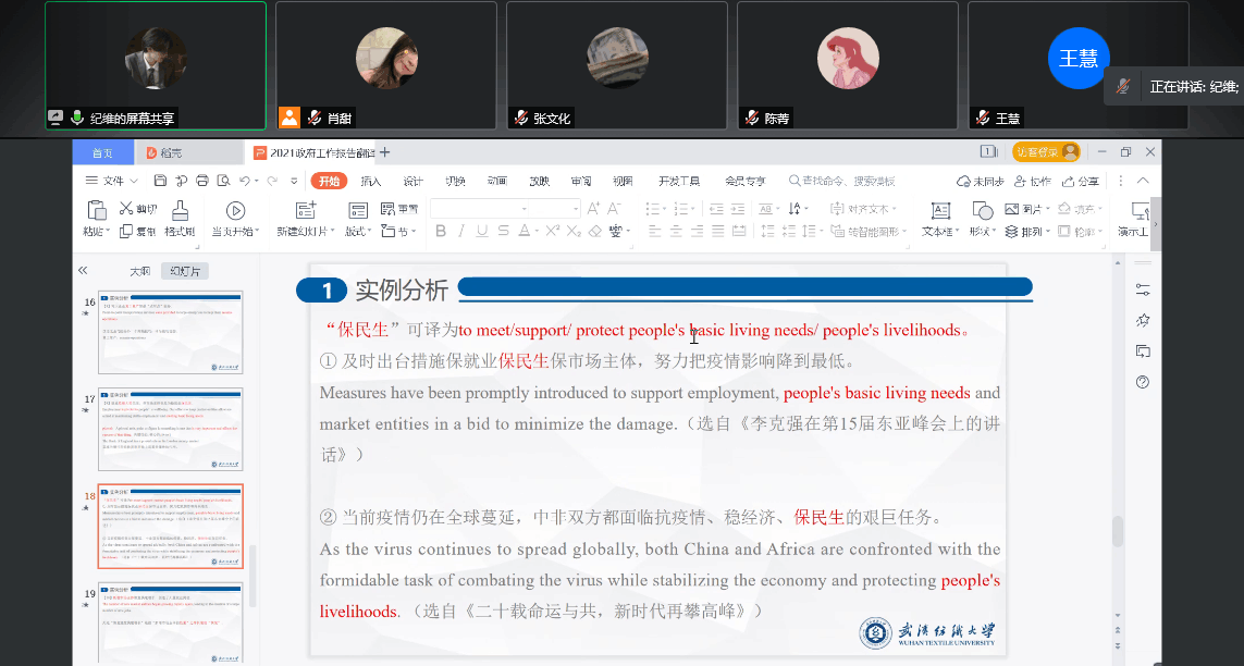 纪维同学以“2021政府工作报告翻译心得”为主题进行了分享,整理了政府工作报告中的翻译难点和解决办法。例如,遇到一词对多义时,要根据上下文具体分析,灵活变换译法;长句和复杂句药按照英文思维找句子框架,给句子做好成分分析和断句;平时多注意积累专业性词汇,多学习其他文件的翻译;在进行中译英时,汉语无主句需要补充主语或译为被动语态等。