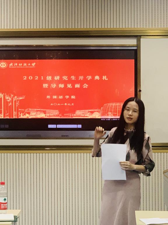 会议伊始,谭燕保院长代表学院对2021级全体研究生新生表示了热烈的欢迎,并对全体2021级MTI研究生提出了四点要求:一是要培养极强的双语能力,在学习中脚踏实地;二是丰富全面的百科知识,注重自身积累;三是熟悉翻译的千般技巧,用理论指导实践;四是通晓各类辅助工具,做新时代的翻译人。她希望,全体2021级研究生能在纺大、在外院学有所成,学有所获,在充实自己的同时,也为学院MTI的发展建设添威助力。