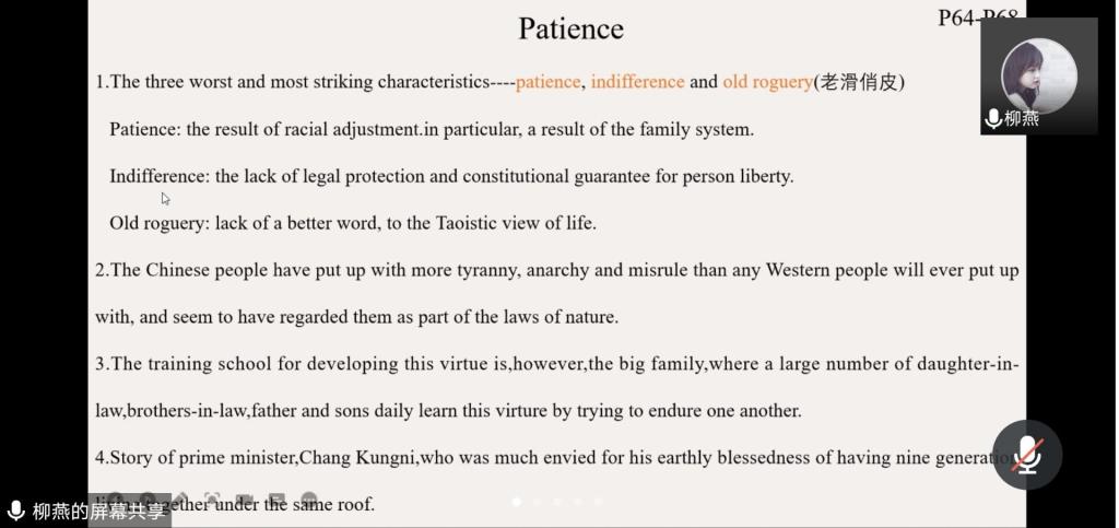 柳燕同学以“《吾国与吾民》读书分享和白皮书《中国新型政党制度》翻译”为主题,首先对《吾国与吾民》这本书做了一个简要的介绍,然后书中包含中华文化典故的句子翻译做了一个讲解,并对“patience, indifference, old roguery”的翻译做了详细的分析。接着,柳燕同学对白皮书《中国新型政党制度》做了自译与官译的对照,分析了时政文本中缩略词、四字格的如何恰当地进行翻译并对文中的固定表达做了总结。最后,柳燕同学向同学们推荐了《Nature》杂志,建议大家平时阅读,可以扩充自然科学方面的知识,提高学术英语水平。