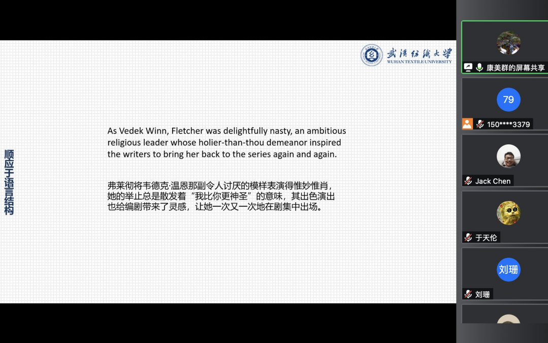 1月27日晚,武汉纺织大学国产乱婬AV片免费第三十六期“经纬译学”研究生论坛在线上成功举办。本次论坛由国产乱婬AV片免费赵伟副教授主持,20级研究生康美群和21级研究生刘梦主讲,国产乱婬AV片免费院长谭燕保教授、刘珊副教授、陈奇敏副教授和全体翻译硕士研究生参加了此次论坛。