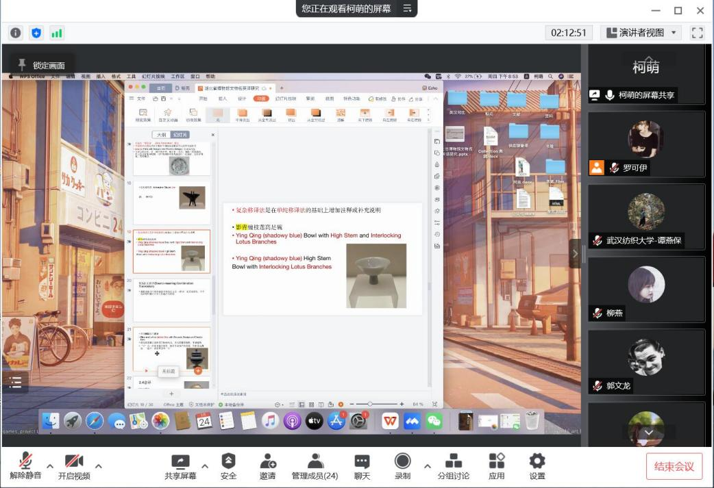 第二位汇报人柯萌的汇报主题为“湖北省博物馆文物名英译研究”。她的汇报共分为四个部分。汇报开始,柯萌先分享了湖北省博物馆、故宫博物院、南京博物院、大英博物馆的官方网站。第一部分她提出“文物翻译有助于文化交流和文化发展”的观点。第二部分她分享了自己总结的文物翻译的三个特点:特色性(NationalCharacteristics)、专业性(Technicality)和准确性(Accuracy)。在介绍特色性时,她着重介绍了陶瓷相关的专业术语,例如陶瓷坯(Ceramicblank)、胎体(body)和釉(glaze)。然后介绍了独具特色的青花瓷(BlueandWhitePorcelain)和粉彩(famille-rose)的翻译,青花四爱图梅瓶图的翻译为Meiping-vase Decorated in Blue-and-white with Scenes of the Four “Cherishes” in Panels.粉彩荷花吸杯译为Cup with Famille-roseLotus Design。然后她以青瓷四系罐的翻译Celadon Jar with Four rings为例介绍了专业性。该部分的最后,她指出文物翻译是为了交流和沟通,因此在翻译时必须将文物的特点准确表达出来,体现准确性。第三部分她分别介绍了四种文物翻译的策略,分别是直译、移译、音义兼译和意译。基于这些策略她介绍了霁蓝釉碗(Sky-clearing Blue Glazed Bowl)、斗彩龙凤纹盘(Doucai Plate with Dragon and Phoenix Design)和原始直线纹罐(Primitive Porcelain Jar with Perpendicular)等。在第四部分,她提出了文物翻译中漏译和误译的问题。