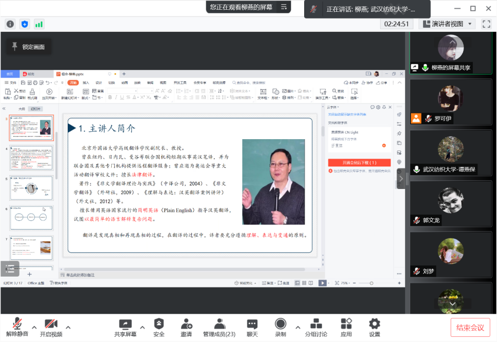 随后刘珊副教授进行了点评。针对柯萌的汇报,她给出了这样几点的点评。1、肯定了柯萌同学的研究精神、查证精神和批判性思维。2、肯定了选题并介绍了瓷器相关语料库和图料库建设情况。3、希望她能够坚持翻译查证研究。针对柳燕的汇报,刘珊老师也对强势动词进行了解惑。