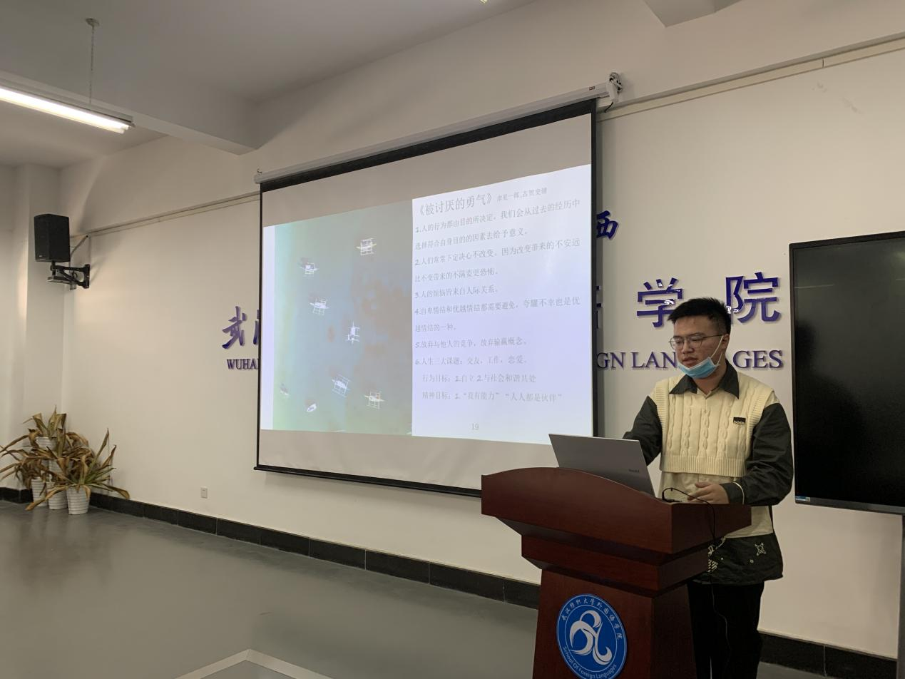 第三位汇报人沈逸以“从个体心理学角度浅析《绝叫》女主人公的悲剧人生”为主题进行汇报。他的汇报分为四个部分。第一部分介绍了阿德勒和个体心理学。第二部分分享了社会派推理小说《绝叫》,社会派推理小说代表人物有:松本清张、森春诚一、山崎丰子。接下来沈逸讲述了《绝叫》中女主人公铃木阳子的一生:在社会中遭受种种伤害然后“黑化”,从个体心理学的角度分析人物性格的变化。最后一部分他结合自己的经历、感悟谈论了对整部小说以及女主人公铃木样子的看法:不要陷入比较。