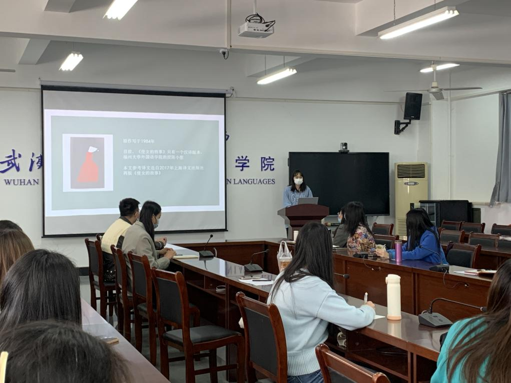 首先,罗可伊同学以“《使女的故事》中服饰的女性主义翻译”为主题,讲述了女性主义翻译理论和策略:她着重介绍了路易斯· 冯· 弗洛图的加写前言和脚注(prefacing and footnoting)、增补(supplementing)、劫持(hijacking)三个翻译策略。罗可伊对福州大学外语学院教授陈小慰译中的服饰翻译进行了对比分析:比如对于原文中yoke的翻译,虽然作者表面使用了yoke这一词“牛轭”的意思来形容使女的服装,但是她同时也表达yoke“枷锁”的意思,使女服就是对女性的枷锁,一旦穿上这件衣服就再无自由,再无自主能力。所以她在自译时选择了增补的策略,直接将这一点表达出来。罗可伊对于女性主义和女权主义提出了思考:冲破束缚、勇于抗争、清醒独立、女性互助。