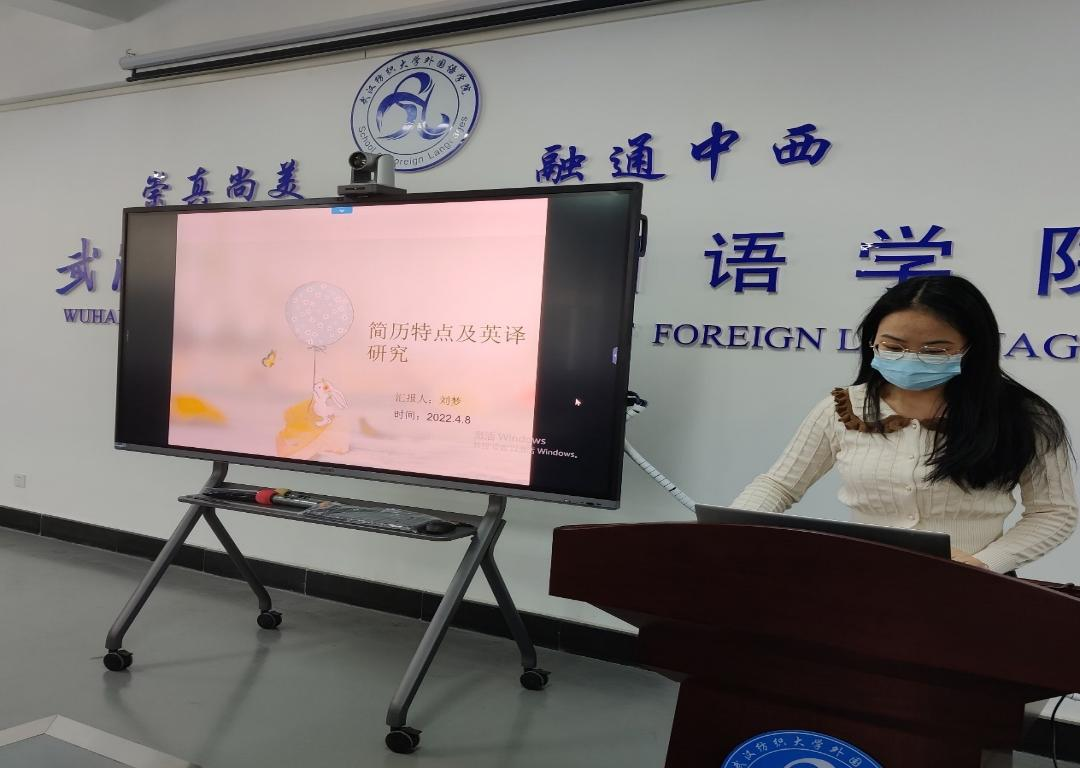 第二位主讲人刘梦同学汇报主题是“简历特点及英译研究”。首先刘梦同学阐述了简历的定义,其应该是一份“concise written introduction”,特点应该涵括“standard language ,smooth writing, compact structure, distinct gradation.“,功能是”introduce your own situation”。第二章刘梦同学简要介绍了“resume”这个单词的来源,它最开始是法语单词,等同于“abstract”,文艺复兴时期著名画家达芬奇首次使用这个单词,一百年后的16世纪晚期“resume”开始频繁使用于英国。接下来刘梦同学简要介绍了简历的格式,认为其由”title, picture, text“组成。除此之外,她认为翻译简历时应注意四点要求,分别是:1. expressiveness in linguistic norm. 2.clarity in coherence. 3. Faithfulness in idea. 4.fluency in expression. 最后刘梦同学分享了一份样例简历,并讲解其中翻译的一些特点和技巧。