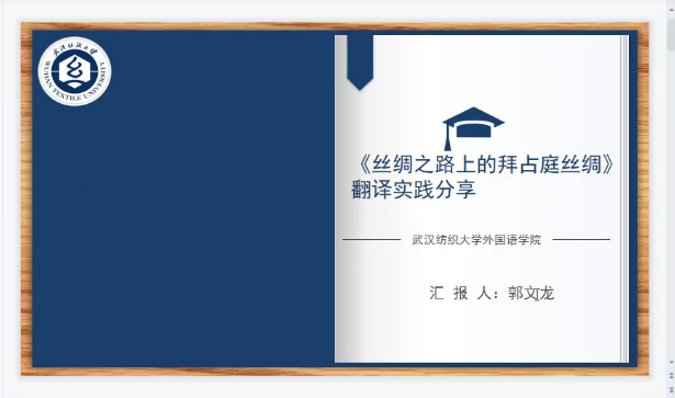 第一位汇报人郭文龙同学分享的是《丝绸之路上的拜占庭丝绸》的翻译实践报告。郭文龙首先详细介绍了切斯特曼翻译规范理论,指出翻译规范分为期望规范和专业规范两种,而专业规范的范畴又可以分为“责任心规范”“交际规范”以及“关系规范”。随后,郭文龙运用上述翻译理论,对实际案例进行了深入分析。由于所选章节讲述的内容为拜占庭丝绸中的神话传说,与中国的神话存在一定的文化差异。所以,为了满足读者群的期望,郭文龙采用归化,对拜占庭神话中的神兽信息采取了“中式变化”的翻译方法。随后,针对“simorgh”的翻译,老师和同学们展开了激烈的讨论。郭文龙选择将“simorph”音译为“森穆夫”,但这种处理方法会使读者感到困惑,赵老师指出,翻译时应考虑读者感受,选择读者熟悉的意象,可译为“神鸟”。