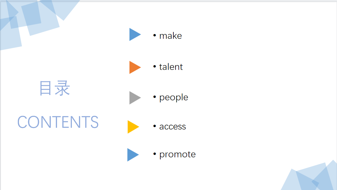 第三位汇报人武静波同学结合实际经验,为我们讲述了一些高频词汇的汉英翻译误区,呼吁大家打破思维定式。武静波摘取了几个常见的英语单词,分别为“make”,“talent”,“people”,“access”以及“promote”,结合具体翻译练习指出了我们普遍存在的中式定向思维。在介绍完这些词汇在具体语境中的地道英译方法后,武静波呼吁大家多多反思,打破思维定式,发人深省。