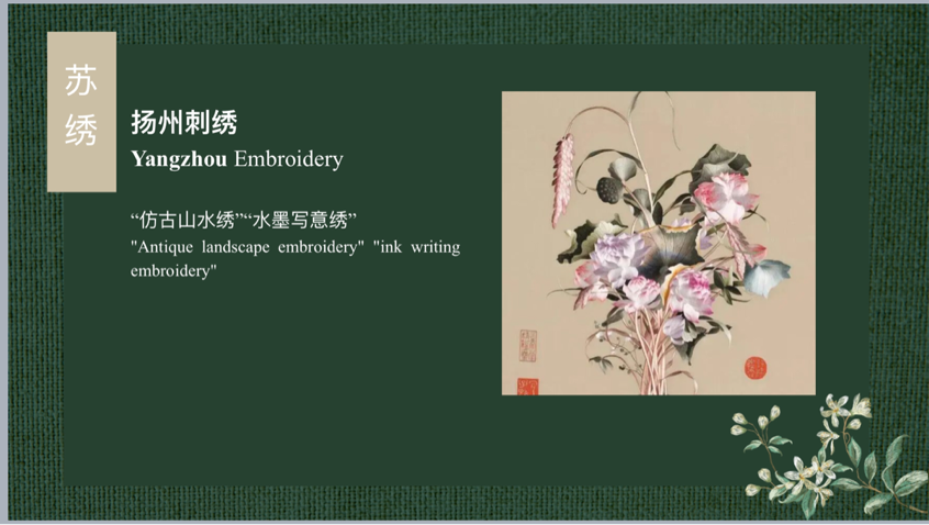 最后一位汇报人王馨语同学分享的主题是“蜀绣:传承保护与创新”。她讲解了部分蜀绣针法,如“缠针”——wrapping stitch、“乱针”——random stitch等,并向同学们展示了部分蜀绣名作。随后,她将蜀绣和汉绣进行对比并分析了蜀绣发展现状及其对策。最后,王馨语同学总结了蜀绣的传承价值,强调了非遗文化传承的重要性。