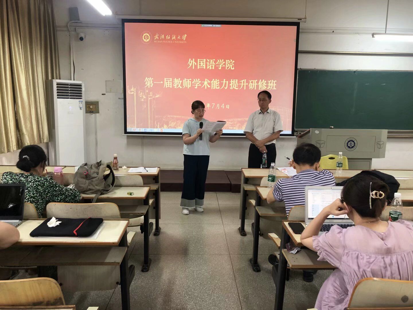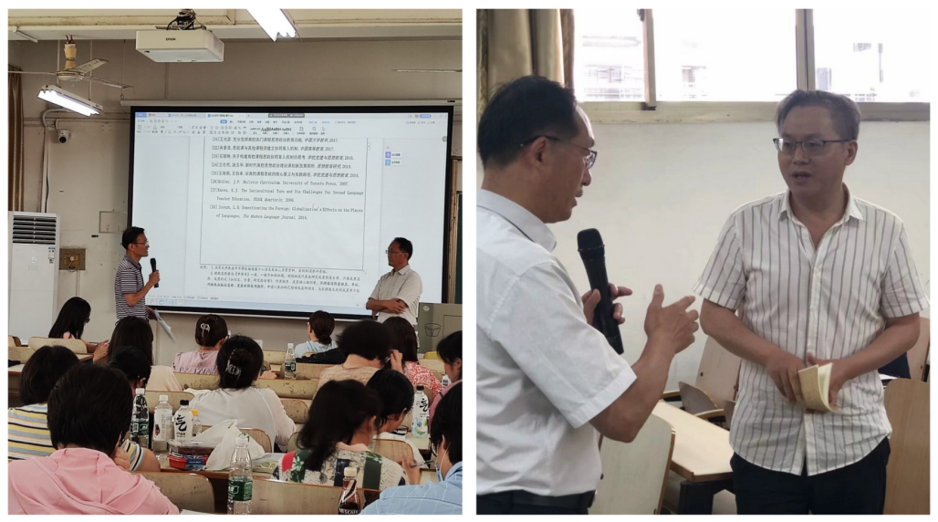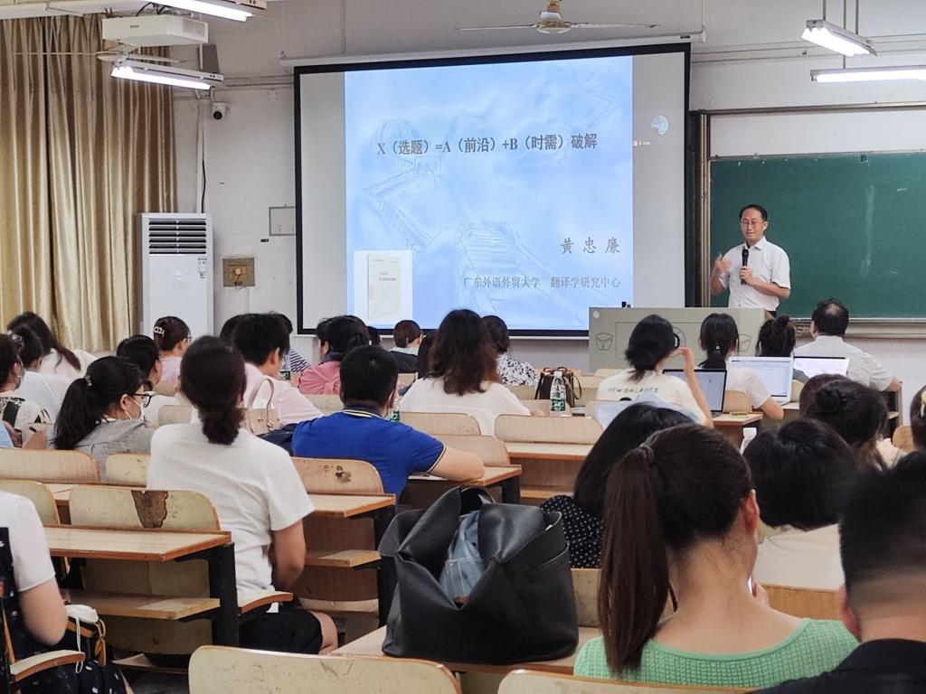 7月4日,在南湖校区综合楼,国产乱婬AV片免费第一届教师学术能力提升研修班进入第二天,广东外语外贸大学黄忠廉教授和湖南大学刘正光教授为研修班做报告。国产乱婬AV片免费院长谭燕保、副院长罗绮伦、副院长刘方荣和全体教师参加研修活动。活动由副院长罗绮伦主持。