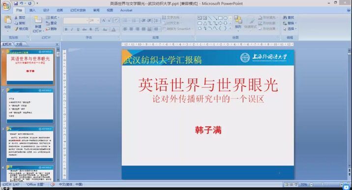 接着,韩教授从三圈层、“世界英语”与“文学英语”、“文化英语”对比,集中论述了当前“英语世界”存在着的矛盾之处和现实性问题。最后他从六大问题着眼:局限于英美等英语母语国家的问题、把德国算进来的问题、等同于整个西方的问题、多层次范围的问题、使用英语为标准的问题、复合含义的问题,概述了“英语世界”与世界眼光之关联。“英语世界”及“中国话语权”是事关文化传播的关键术语。