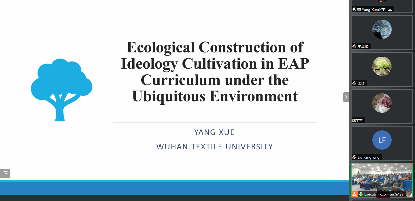 23日下午副院长刘方荣和巴方教师共同主持会议。杨雪老师在会议上做了“沉浸式学科英语课程思政的生态建设”主旨报告。她引用著名学者黄国文的观点:英语教学是教师、学生和教学管理共同组成的一个完整的生态系统。学科英语是通用英语和专业英语的桥梁,学科英语要注重培养学生的学术伦理和学术行为规范、开发学生的创新思维和批判思维等学术能力,还要培养学生的学术价值观。杨老师强调把课程思政和学科英语教学内容融合是完全可能并且必要的,这种融合能有效地提升教学和学习效率。