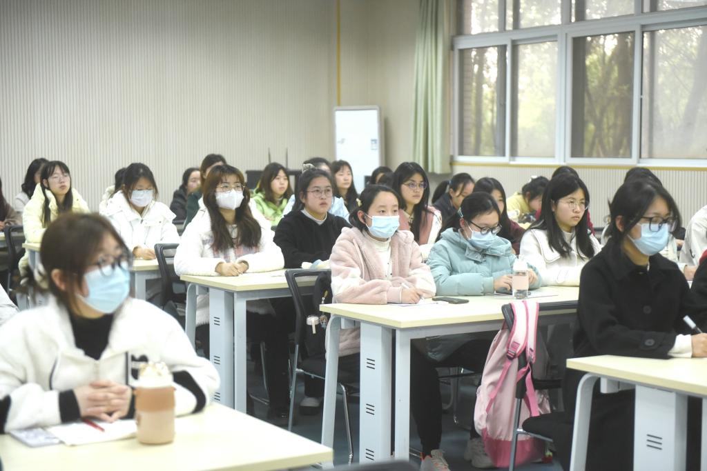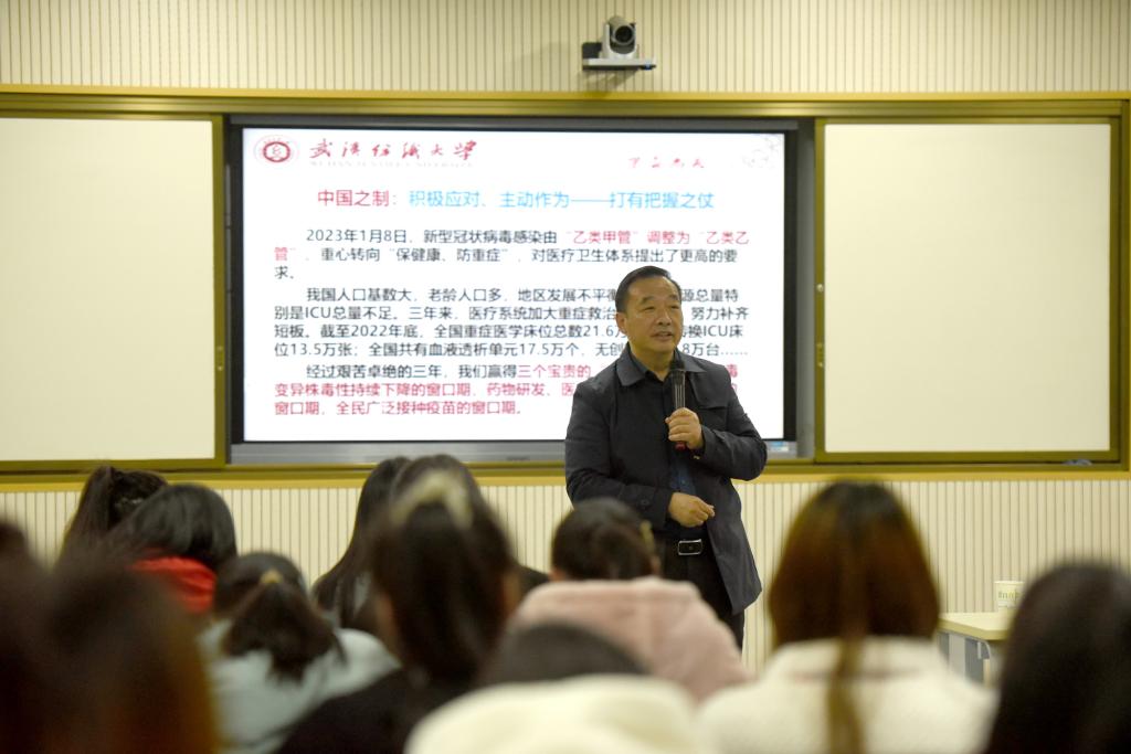 “三年抗疫经历已经成为回忆,这三年我们看到了国家坚持人民至上、生命至上的决心,参与了国家为保护人民生命健康所做出的巨大努力,也见证了国家所取得的巨大胜利。”黄国辅以自己防疫志愿者的亲身经历和同学们一起回忆三年的抗疫历程,结合自身的专业特长和中华优秀传统文化充分阐述了“中国之制”的优势,强调“中国之制”是中国人民抗疫成功的底气所在,所谓“惟其艰难,方显勇毅;惟其磨砺,始得玉成”,并勉励同学们正确看待“中国之制”,学好外语专业知识,练就过硬语言本领,厚植家国情怀,在世界舞台上讲好中国故事、中华优秀传统文化故事、中国战疫和纺大故事。
