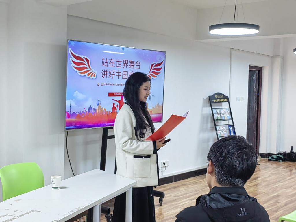 在机械学院,柯婉辰结合《习近平谈治国理政》中篇章内容,以“在世界舞台讲好中国故事”为主题,用双语进行原文、心得学习分享,号召青年学子敢于面对国际环境的挑战,迎难而上,珍惜机遇,努力学习,提高自身素质,争取未来在国际舞台上讲述“中国故事”,为实现中华民族伟大复兴的中国梦而奋斗。