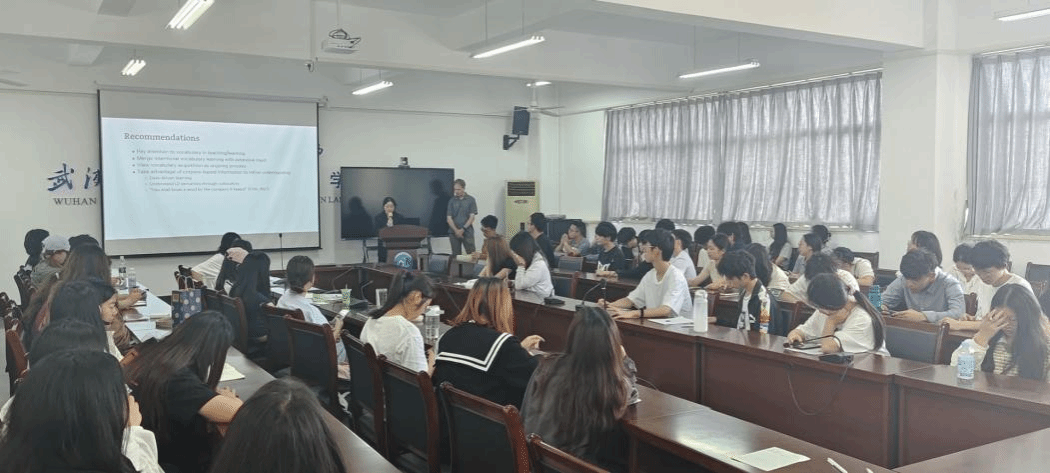 5月6日下午,世界著名科学家来鄂讲学计划专家、美国爱达荷州立大学的语言学家Prof. Brent Wolter在崇文楼为国产乱婬AV片免费师生作题为“Second language vocabulary acquisition: A beginning without an end?”的学术讲座。国产乱婬AV片免费副院长刘方荣、商务英语系主任吴志杰和英语及商务英语专业23级全体学生参加并聆听了本场讲座。讲座由商英12301班司嘉琪同学主持。