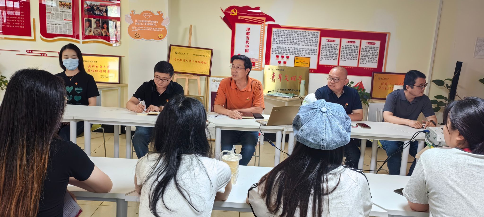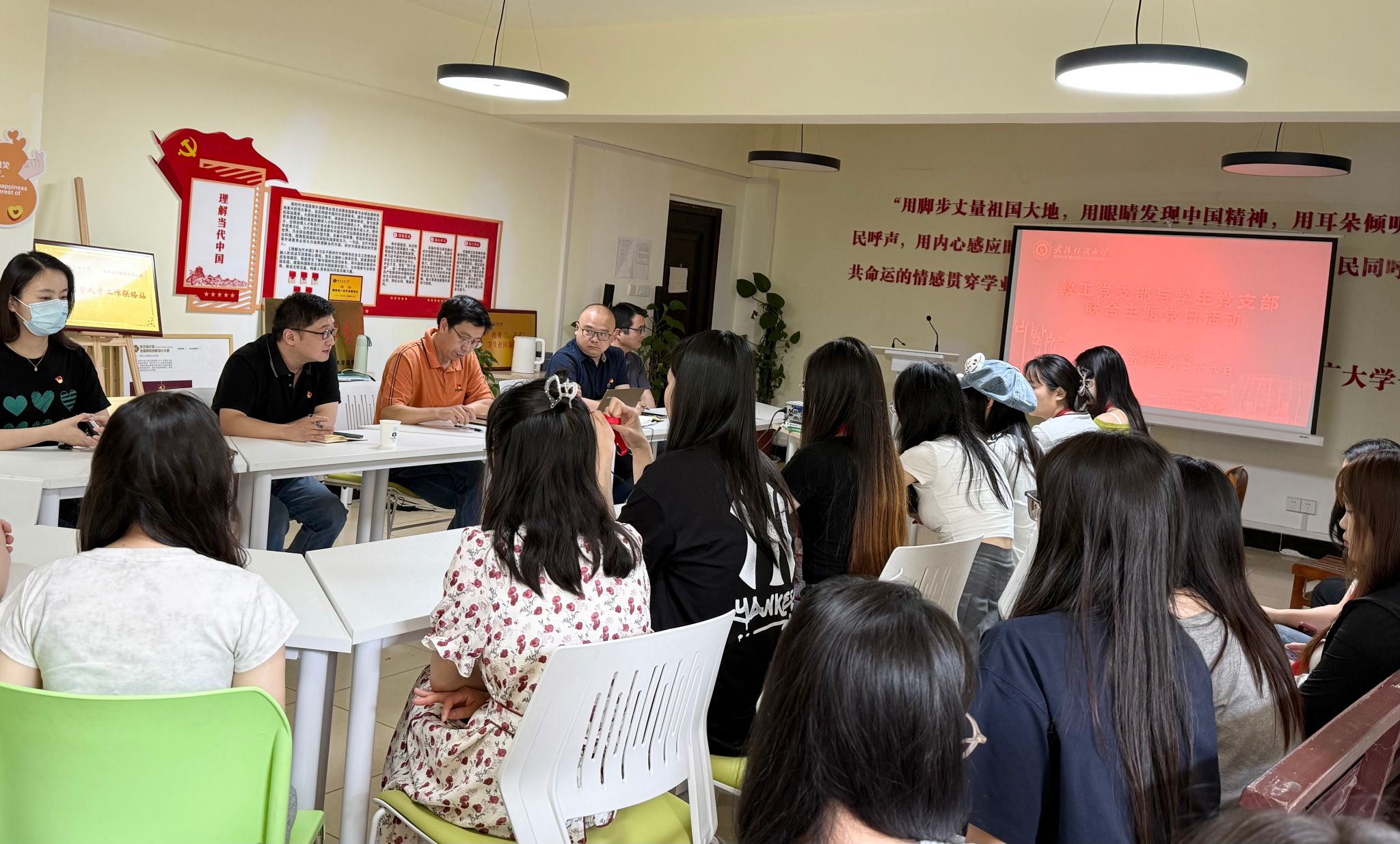 为深入学习贯彻习近平新时代中国特色社会主义思想,进一步推动全面从严治党向基层延伸,增强师生党员的纪律意识和责任担当,武汉纺织大学国产乱婬AV片免费于5月26日上午,在读“习”有声学生成长服务站开展师生党支部联合主题党日活动暨毕业生党员教育。国产乱婬AV片免费党委书记胡中原、党委副书记彭阳慈航、教工第四党支部全体教师党员、全体毕业生党员参加此次会议。
