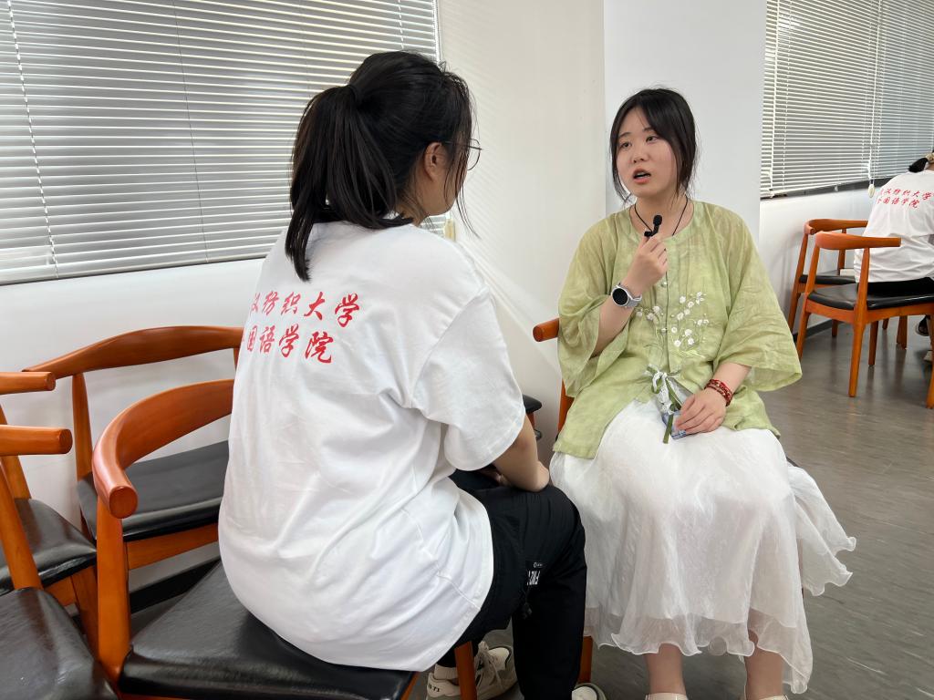 湖北省非物质文化遗产保护中心办公室副主任程琛,与实践团同学们互动交流。程琛向同学们娓娓道来近年国家层面主办的荆楚文化和荆楚非遗走出国门展览活动,详细介绍了传统漆器制品由礼天之器到飞入寻常百姓家的生活用品的回归理性和市场转型,科学诠释了作为多元文化相互激荡、彼此融合的产物——武汉码头文化对荆楚文化和荆楚非遗传播的促进作用,深入浅出地用“硬核干货”连接文化和受众。她表示非遗文化早已在百姓生活中根深蒂固,与每个人的生活息息相关。荆楚文化和荆楚非遗的保护与传承需要将传统技法与现当代人的价值观紧密相连,荆楚文化和荆楚非遗外译在传统手艺与国外民俗的“东学西渐”中发挥着不可替代的桥梁作用交流体验,有助于荆楚文化和荆楚非遗走出湖北、走出中国、走向世界,让各国朋友们接纳、接受和认同。