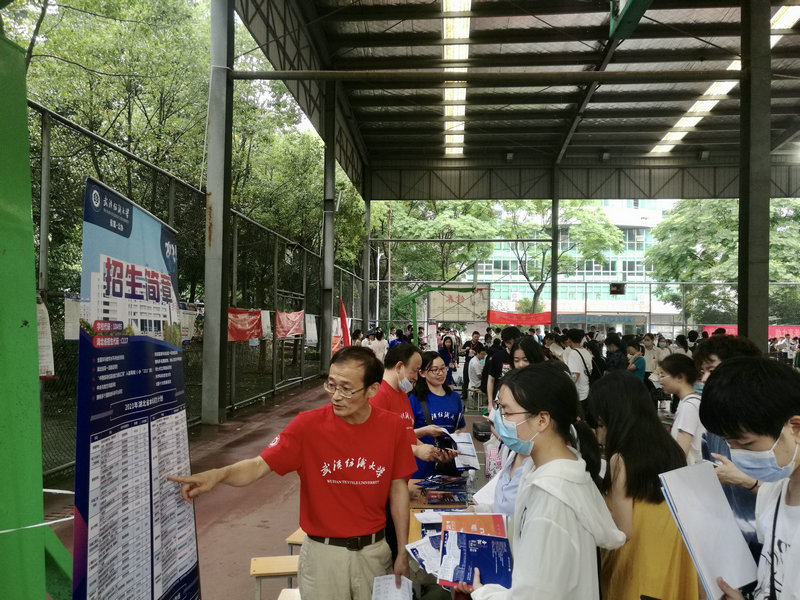 招生宣传工作队6月25日上午从武汉出发前往宜都一中,下午两点在该校风雨操场开始招生宣传工作。三点开始狂风暴雨,但挡不住学生家长及学生们问询的热情。招生团队在罗绮伦副院长的带领下,针对2021年招生政策的新变化,对前来咨询的家长及考生娓娓道来,在及时释疑的同时,吸引了不同分数层次的首选历史和首选物理的考生及艺术生表达报考意愿,并纷纷留下各自的考分及意向专业等信息,招生现场非常火爆。