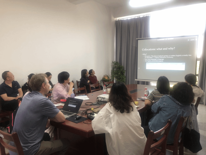 Prof. Brent Wolter以“L2 collocational knowledge: Putting the pieces together”为题向老师们介绍了自己最近在二语词汇习得方面的研究,聚焦词语搭配(collocation)。他阐释了以词语搭配作为研究重点的原因、其识别和描述,以及影响其习得的原因。老师们就词汇学习的质量和数量的关系、二语习得中的母语迁移、学生英语词汇过度使用现象以及一些教学中遇到的问题和Prof. Brent Wolter进行了积极的讨论。最后Prof. Brent Wolter还为老师们未来的科研提供了一些有益的建议和可行的思路,老师们均表示获益良多。