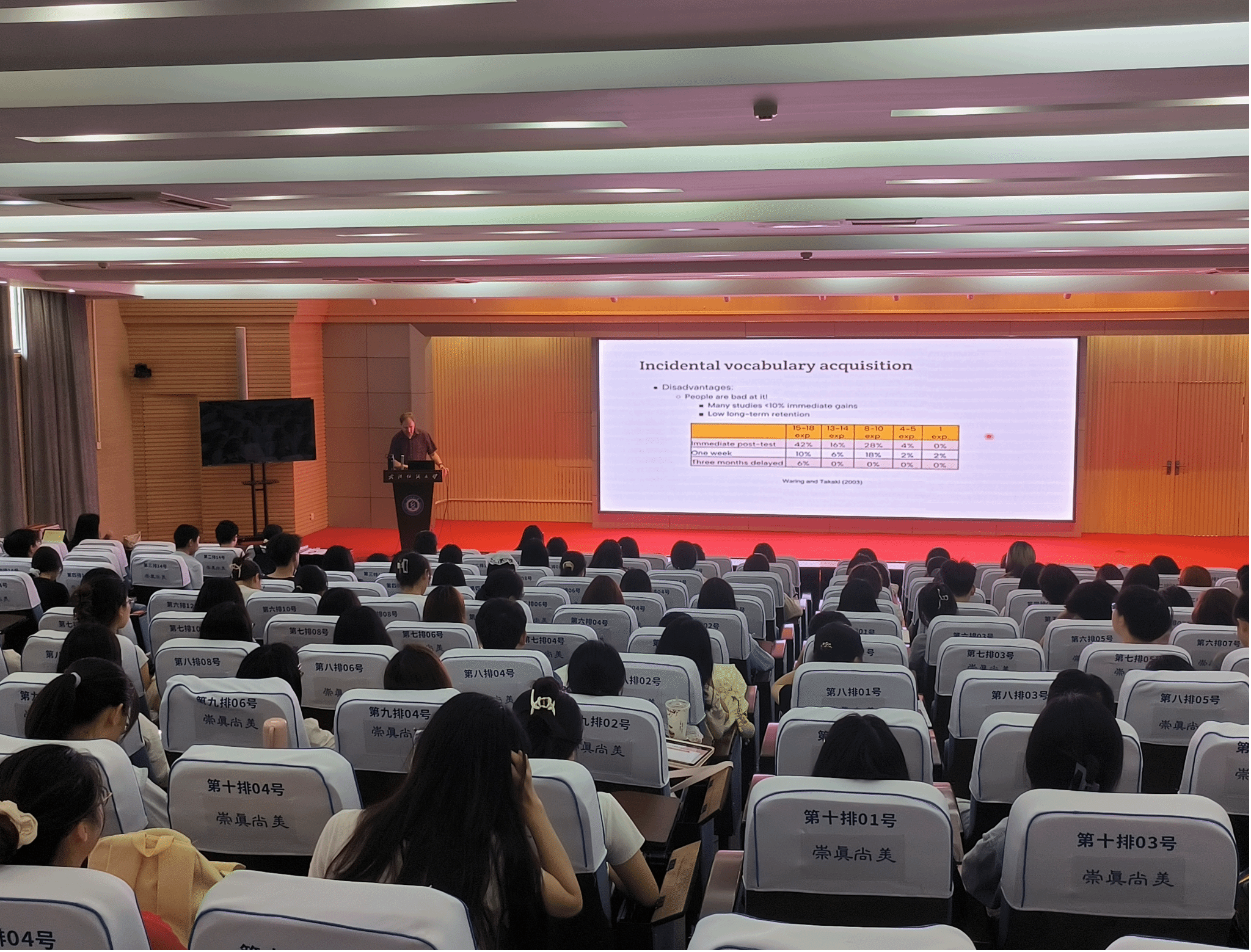 Wolter教授融合具体事例以及自身学习经验,生动形象地向师生们传递了合理高效的二语习得方法。他首先介绍了认知心理学中的两种词汇习得方式:词汇附带习得(incidental vocabulary acquisition)和有意习得(intentional acquisition)。附带习得指学习者不是有意学习词汇,而是有其他学习目的,词汇学习只是认知活动的副产品,主要方式为广泛阅读和听力,如看小说,看英文报,听英文歌曲,看英文电影等。附带习得能让学习者在不同语境中多频次地接触词汇,促进词汇相关知识的拓展,并伴随其他学习活动。然而附带习得保持效果差,很难进入长期记忆。有意习得通常指刻意背记词汇表,做词汇练习等。有意习得是去语境化的,词汇习得深度不够,也没有附带习得生动有趣,但它更利于长期记忆。Wolter教授建议结合两种词汇习得方式,通过有意习得扩大词汇量,辅之以附带习得,依靠大量的输入掌握词汇的使用语境。需注意的是,附带习得的语篇生词率不能超过10%,而且无论采用哪种词汇学习方法,都要不断复习。