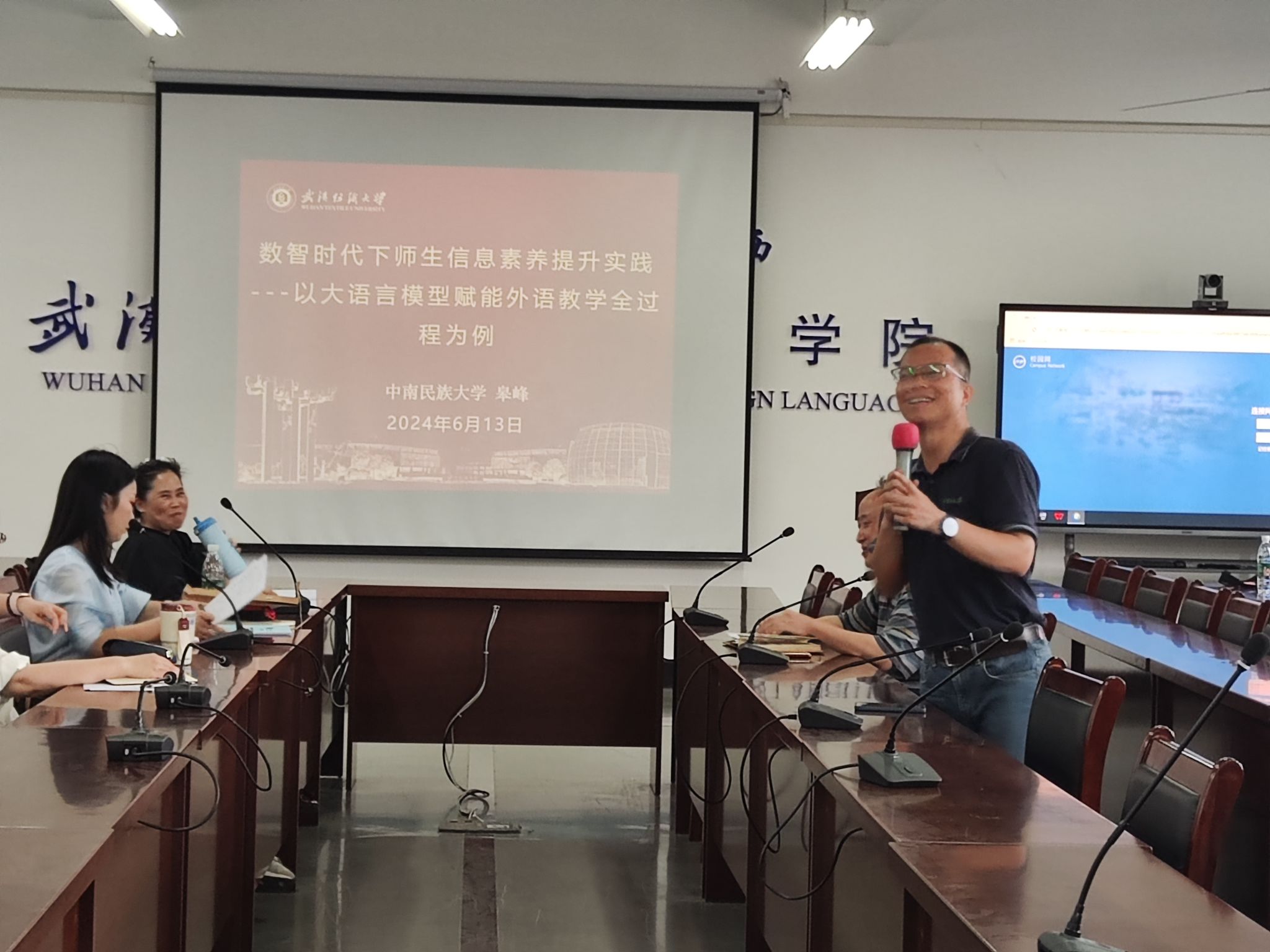 6月13日下午,应学院邀请,中南民族大学国产乱婬AV片免费皋峰副教授为国产乱婬AV片免费师生带来了一场精彩的学术讲座:数智时代师生信息素养提升实践---以大数据赋能外语教学全过程为例。