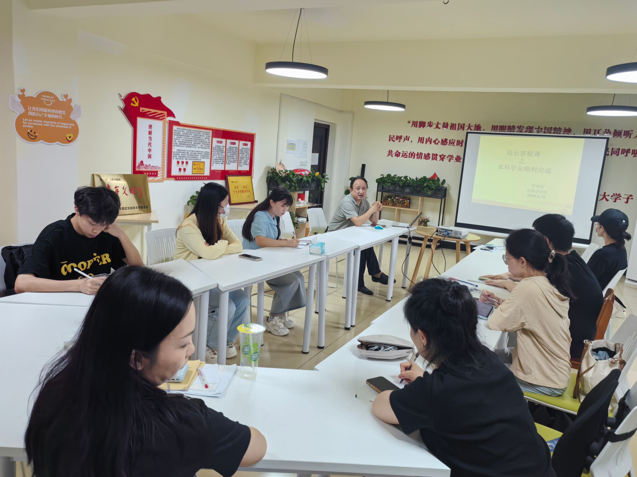 罗绮伦详细询问了同学们的学业完成情况、考试情况以及生活情况,并从“尊循原则、毕业证书和学位证书授予条件、学生系统操作细则以及常见问题”四个方面为学生代表进行了详细答疑解惑。罗院长着重解答了毕业证书和学位授予条件的问题,他强调,同学们一定要重视日常课程学习,重视学分绩点的自查,要按时修完教学计划规定的全部课程 并成绩合格,特别要注意自己的专业必修课平均学分绩点大于2.5,并提醒同学们要按时填写学分清查自查表,及时掌握自己的学分情况,并及时做好重修、补修课程的相关准备工作,以顺利完成本科学业。