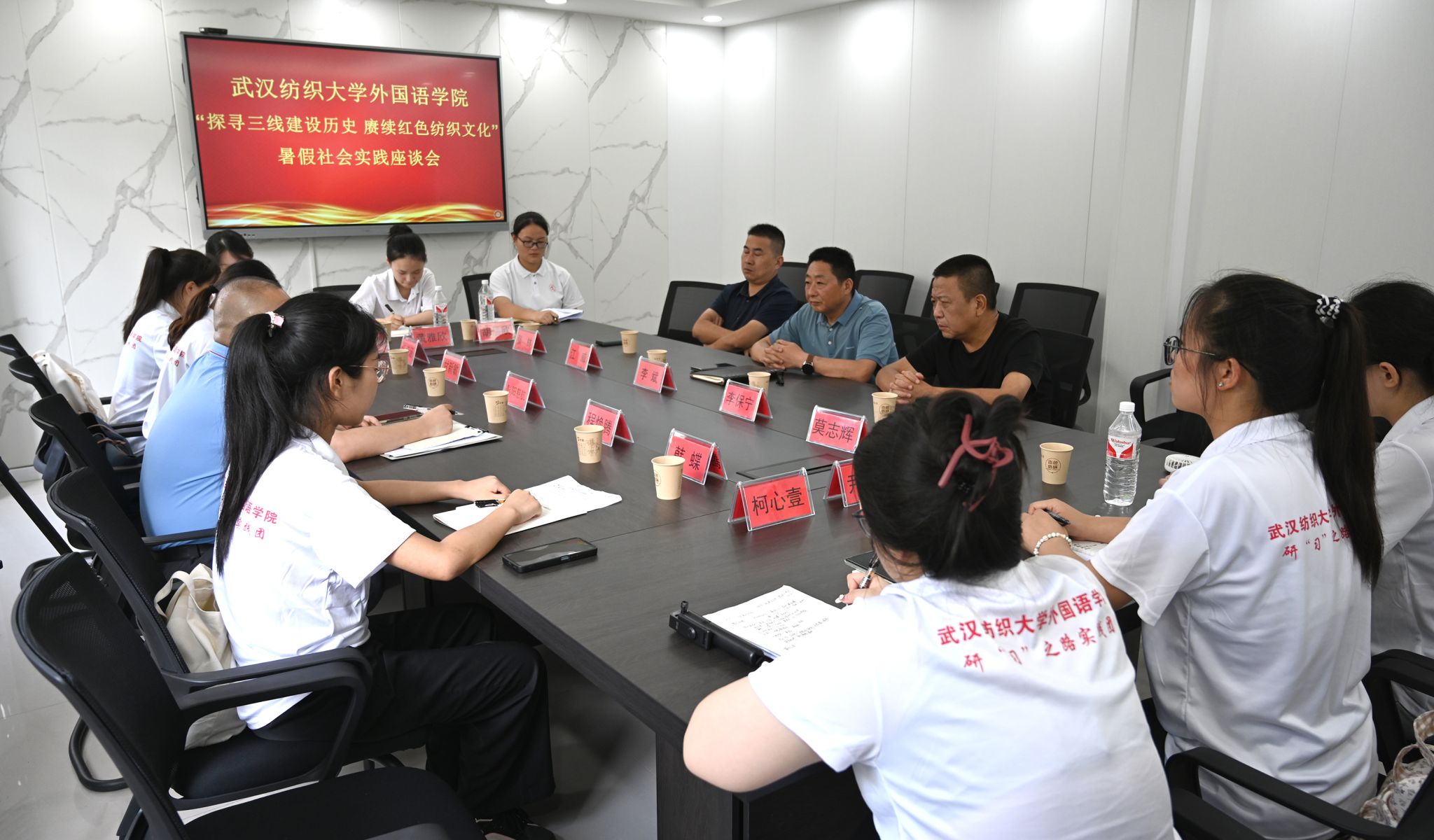 在蒲纺工委,副主任李斌和纺织服装企业家代表与实践团座谈,李斌结合三线建设历史和三线精神的传承,向实践团介绍了赤壁蒲纺片区纺织企业的发展历史、区位优势和未来规划,表示欢迎武汉纺织大学的同学们来到蒲纺,结合自己的专业优势,把蒲纺的故事、红色纺织的故事和三线建设的故事讲好。
