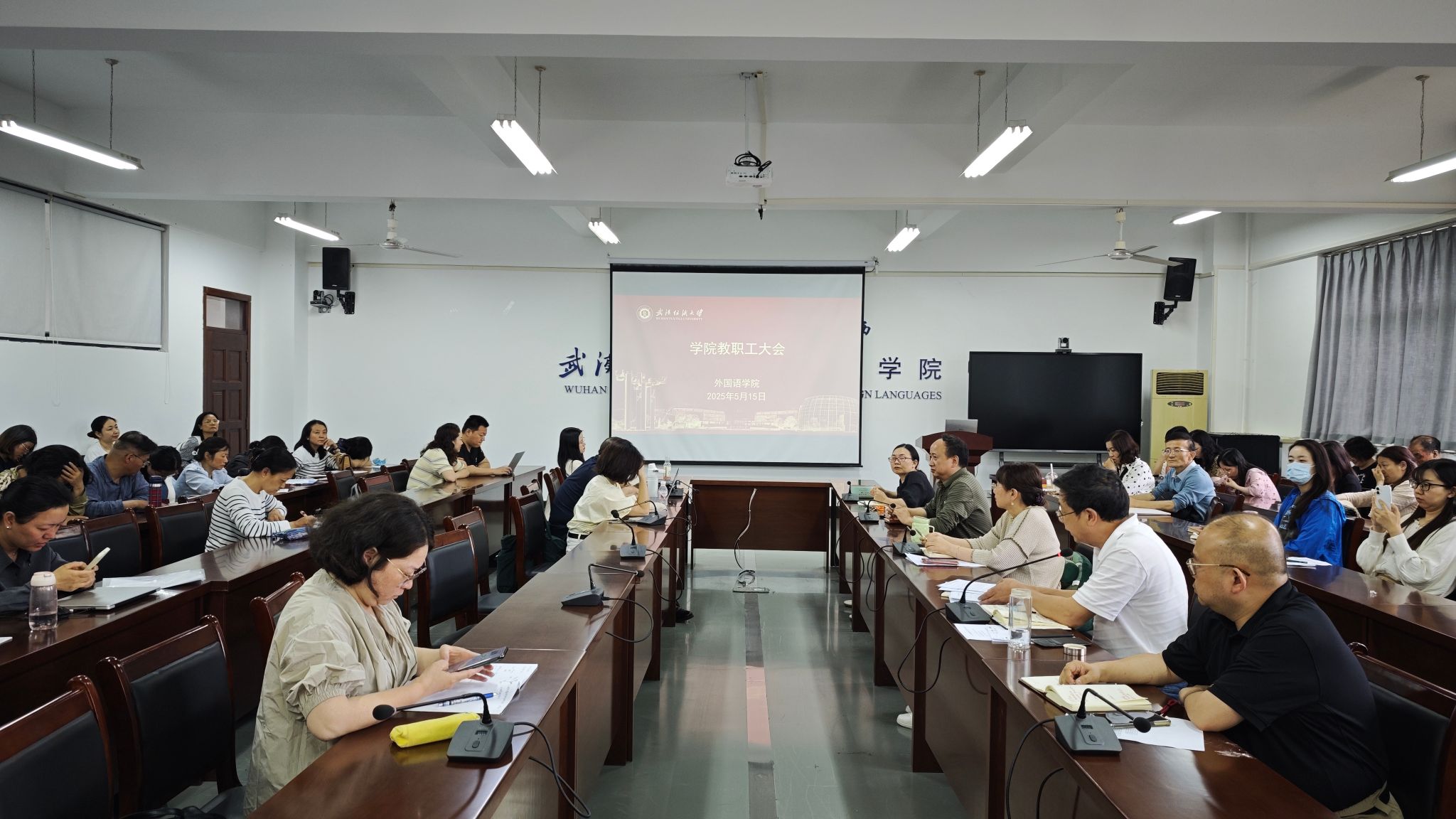 5月15日下午,国产乱婬AV片免费在04-303会议室召开全体教职工大会,开展政治理论集中学习,学院党委书记胡中原主持会议,全体教职工参加会议。