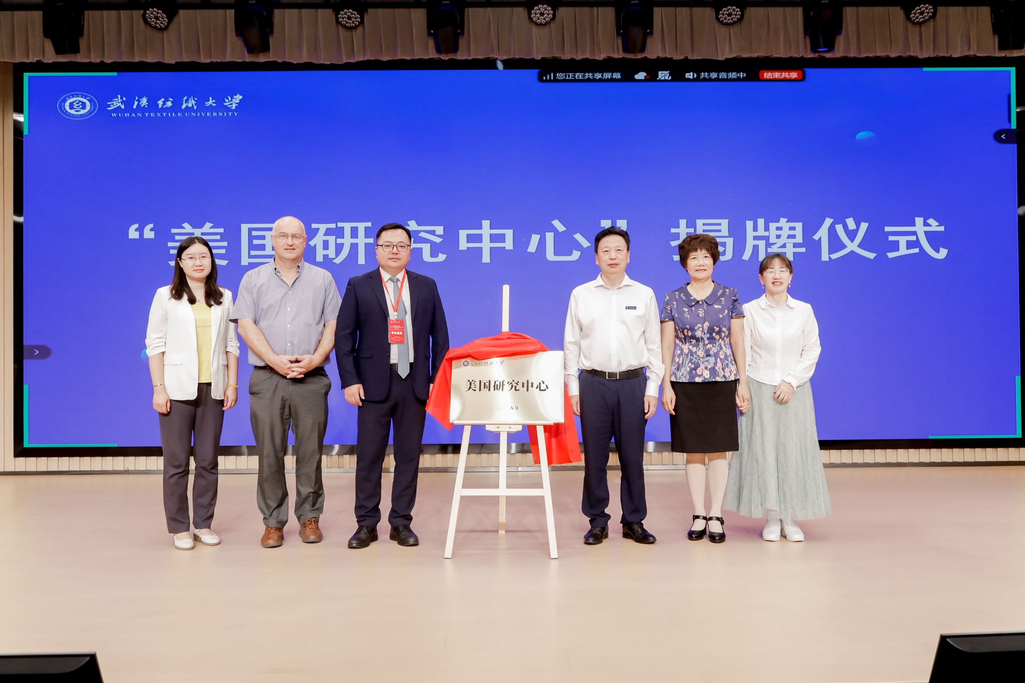 开幕式上,程碧海和陈靓共同为武汉纺织大学国产乱婬AV片免费“美国研究中心”(筹)揭牌。