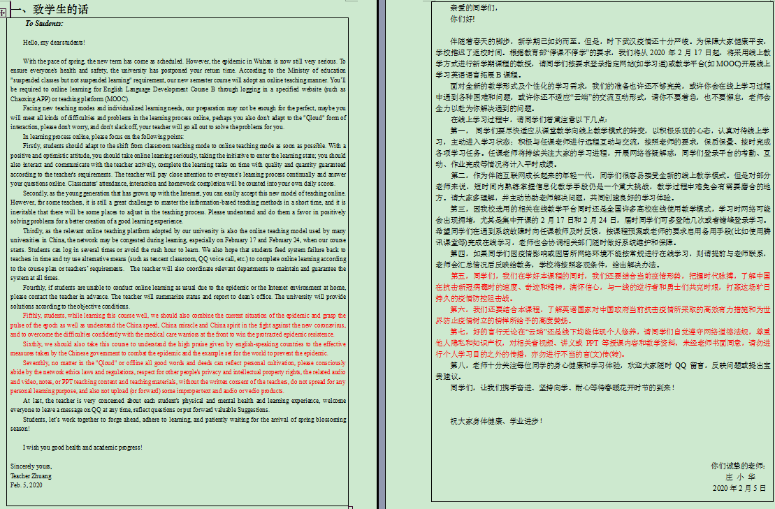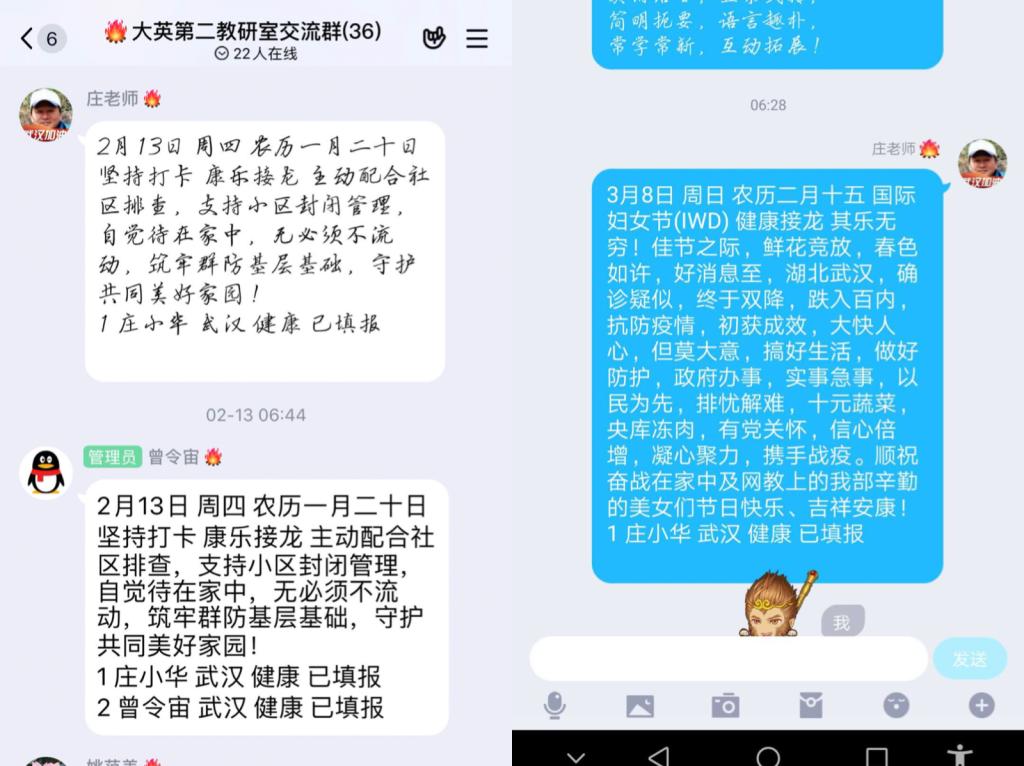 宅家也是护大家,宅家也是战场,不虚度光阴,努力过好每一天,是他坚定的信念。他每天早起打卡、备课,晚间探讨、总结,凡事力臻完善,从学习通到慕课再到腾讯课堂的直播网课,从建班建群签到到上传音视频及阅读资料再到OBE的学习,他都不负韶华,一丝不苟,并将学习心得及时、快乐地与同事分享。