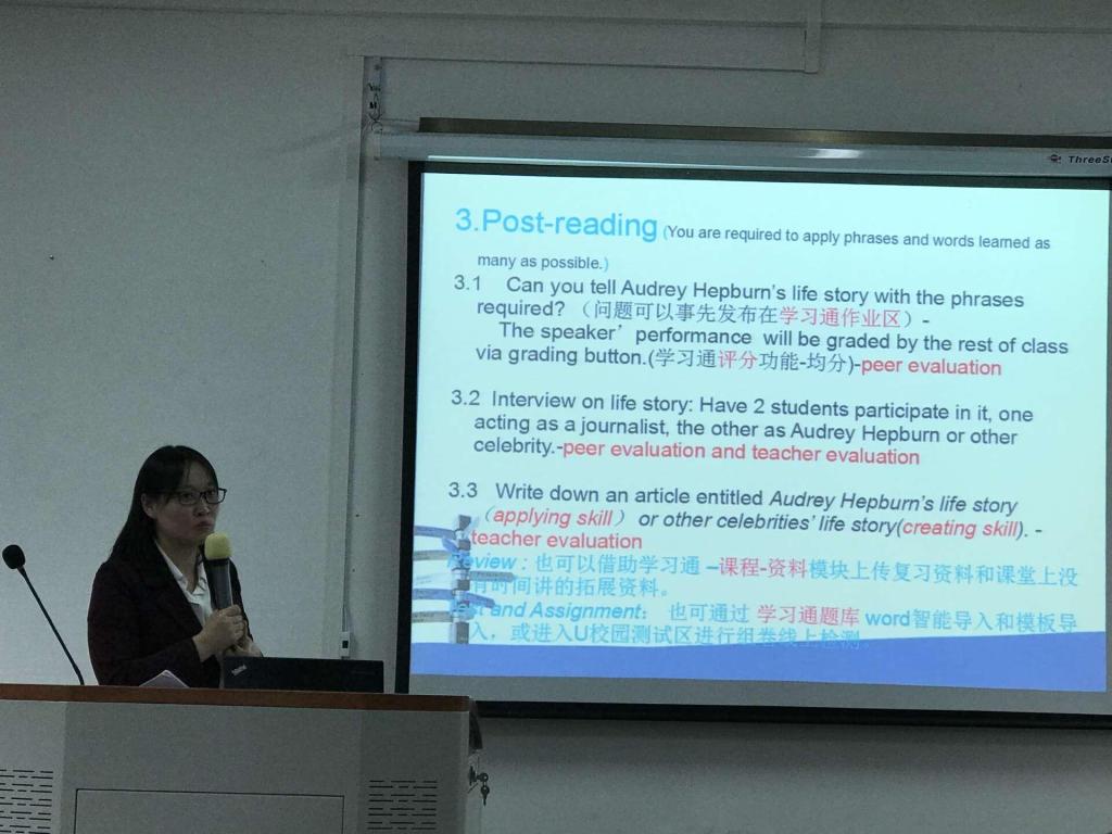 柯细香老师以新视野大学英语第三册第三单元为例,先后阐述了教学内容、教学对象、教学目标、教学方法和教学步骤。关于教学步骤部分,柯老师着重讲解了第三单元课文的教学步骤。她讲述了课前怎样借助COCA、BNC语料库引领学生预习课文;课中怎样借助“学习通”教学平台展开师生互动,展开生生互评,边评边学,以评促学,学用统一;课后怎样借助U校园进行检测和反馈。之后还讲述了怎样在以产出为导向的教学中设计学习任务,达到既定的教学目标。最后分享了其他适合英语教学的平台如“课堂派”、“微助教”等以及服务教学的EV录屏软件。