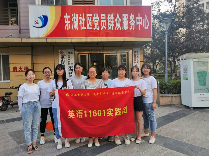 8月12日,学院英语11601实践团一行来到武汉市洪山区东湖社区开展为期10天的红色物业暑期社会实践活动。