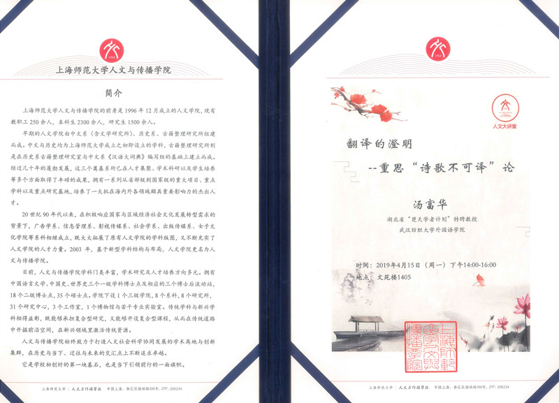 近日,应国家重点学科上海师范大学比较文学与世界文学研究中心邀请,国产乱婬AV片免费“_”特聘教授、湖北省比较文学学会副会长汤富华教授赴上海师范大学作题为《翻译的澄明:重思诗歌不可译论》学术讲座。汤富华教授以其广博的学识、幽默的语言,深入浅出地为师生们梳理了翻译学科的缘起及发展,以比较文学的视角,哲学的方法论,从形而上与形而下两个维度,阐释了翻译的本质,对翻译学科的发展方向,提出了自己独到的见解。