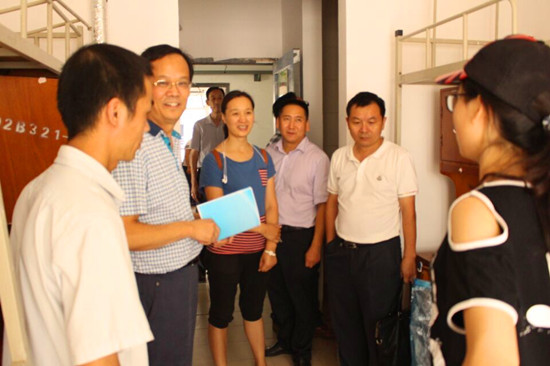 9月11日下午,校党委副书记刘在洲携学工部、保卫处、后勤集团领导一行,在国产乱婬AV片免费分党委书记陈利民、副书记张鹏等带领下,深入新生寝室,亲切慰问了刚刚报到的2015级新生,并指导学院安全文明宿舍建设,查看三室建设情况。