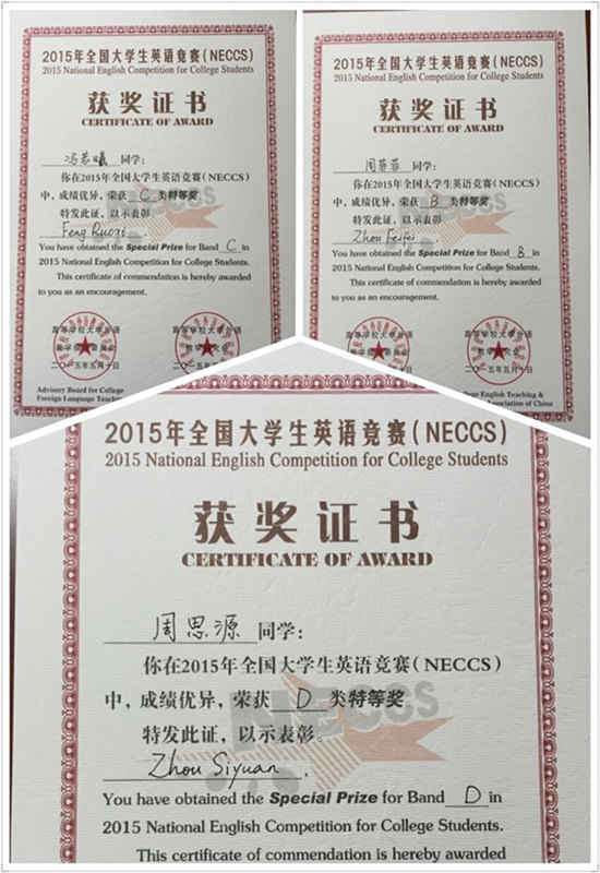 近日,从全国大学生英语竞赛组委会传来喜讯,我校周菲菲(英语11201)、冯若曦(会计11301)和周思源(服工11401)三名同学凭借扎实的英语基本功和英语综合运用能力,在2015年全国大学生英语竞赛中斩获特等奖。此次获奖人数在同类高校中名列前茅,获奖覆盖面广,在竞赛的4个类别中有3个类别都有斩获。尤为可喜的是,在B类(英语专业)的所有参赛院校中,仅有3个学生获得特等奖,而我校的周菲菲就位列其中。