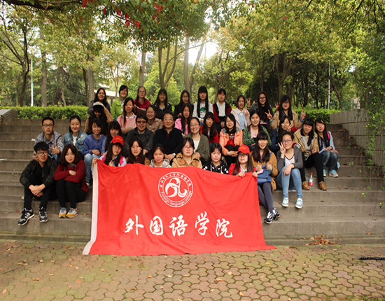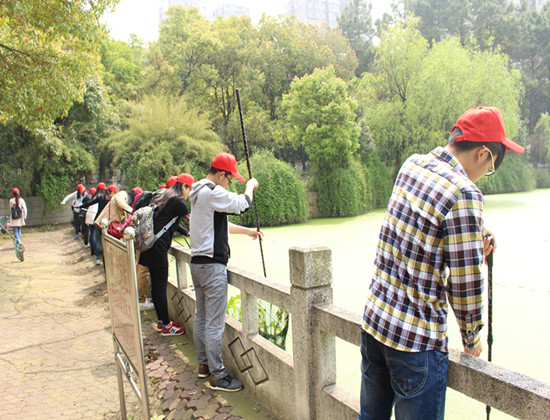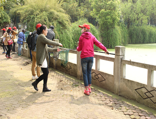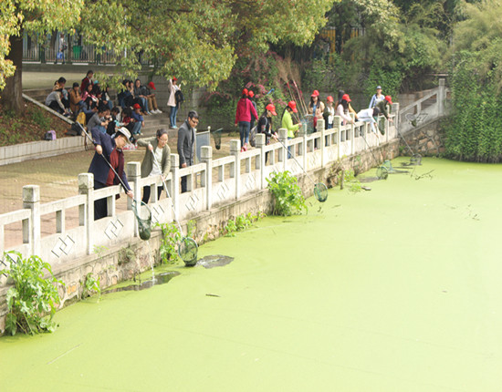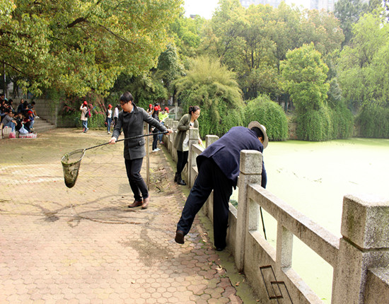 (汤富华和学生志愿者们一起进行志愿捞浮萍活动)