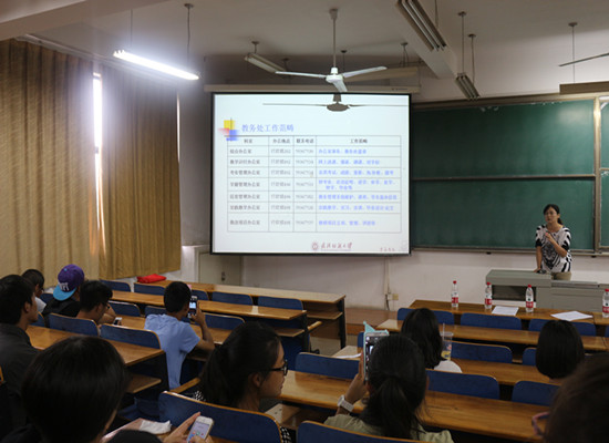 大会的最后一项内容是由教务处胡玲玲老师对新生们进行入学教育。她从教务处职能、教务系统的使用、学籍注册、选课等内容进行了全方位系统的介绍,强调新生对以上内容了解的重要性,从新生最关心的角度出发帮助新生尽快了解大学生活。