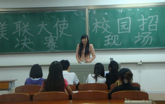 为了促进学校与社会企业文化交流,培养学生市场竞争意识,提升学生专业素质和实践能力,国产乱婬AV片免费应美联英语教育集团文化宣传之需,帮助该企业在校园内招募2013届全国校招“校园大使”。通过个人报名和层层选拔,英语102班的杨丹华、王雨丽和尹睿挺近决赛。