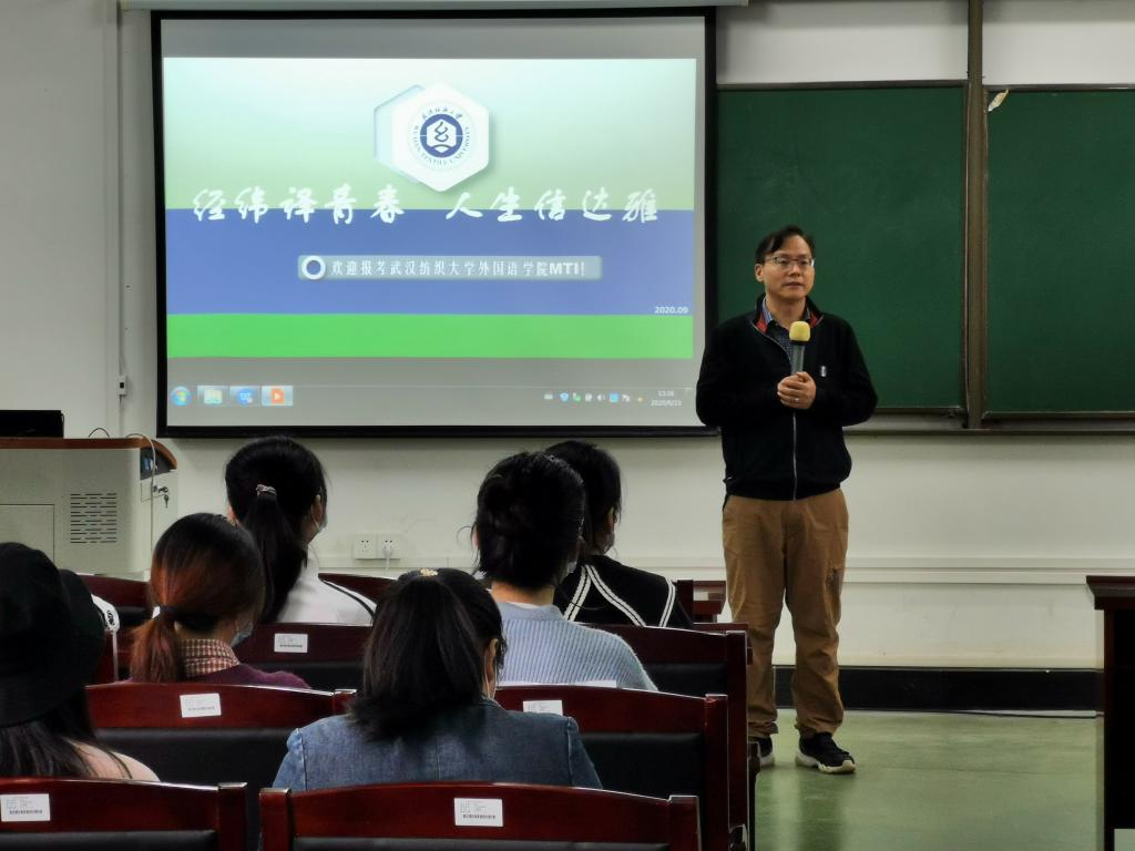 专业教师陆雪芹以“经纬译青春,人生信达雅”为主题,从学院简介、学位点、专家学者、入学考试、资助体系五个方面,向在场同学们详细介绍了本院MTI。