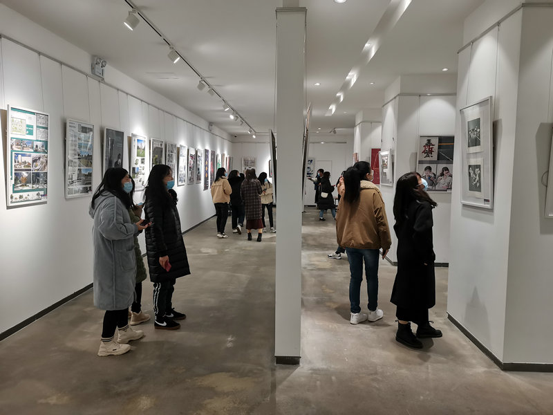 在美术馆,同学们自由地观看展出作品,这些由高校师生自主创作的各类美术作品,大多创意构思巧妙且贴近时代主题,很快吸引了同学们驻足观看。