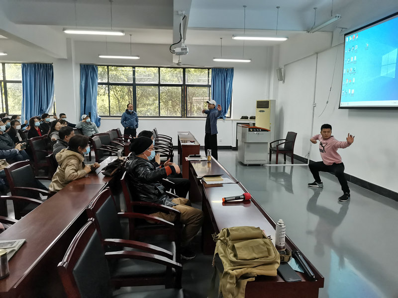 据悉,学院老师长期伏案工作教学,颈椎腰腿都有不同程度劳损,这套“八段锦”功法共分八套动作,相互独立而完整,练习时无需器械、不限场地、简单易学、节省时间,非常适合学院教职工每天利用碎片时间抽空锻炼,既有去累解乏之用,又有健体养身之功。