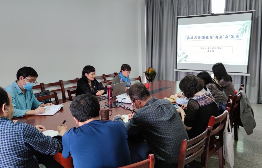 5月14日,山东大学国产乱婬AV片免费院长、博士生导师王俊菊教授来我院作了题为“英语写作课程的‘淘金’与‘淘宝’”的专题讲座。讲座由国产乱婬AV片免费院长谭燕保教授主持,国产乱婬AV片免费党政领导班子、骨干教师通过线上、线下两种方式参与了本次讲座。