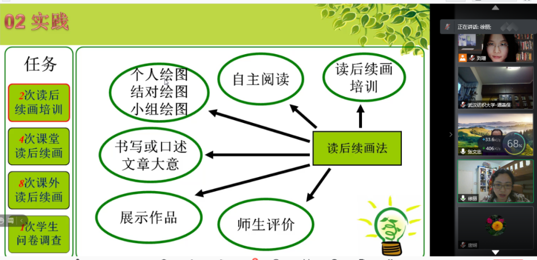 黎杨老师对T4P小妙招进行了三方面的调整:全班讨论一个话题;Presentation & Pk 环节替换成辩论;提供语言资源。他通过工作表(Students’Worksheet)收集一般性的陈述和报告支持性细节。经过两轮实践,他发现很多学生在写作文即产出环节,思想和语言表述上达到令人满意的效果。徐丽老师在学术英语阅读课堂运用了读后续画法来检验学生阅读文章的效果。她一共进行了两次读后续画的培训,四次课堂读后续画活动,八次课外每周个人读后续画读书汇报任务。