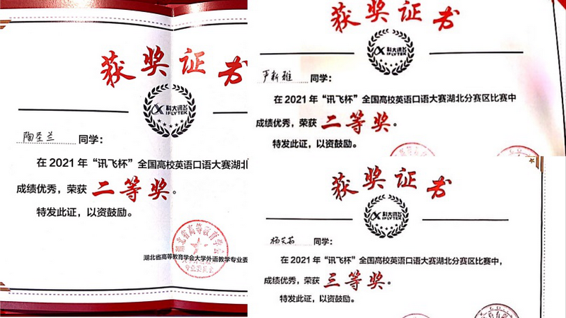 6月20日,由科大讯飞股份有限公司和湖北省高等教育学会大学外语教学专业委员会共同主办的第一届“讯飞杯”全国高校英语口语大赛湖北省决赛在武汉科技大学完美落幕。我校会计11906陶圣兰、英语11901严新雅同学获得省决赛二等奖,服工11901杨艾茹同学获得省决赛三等奖的好成绩。