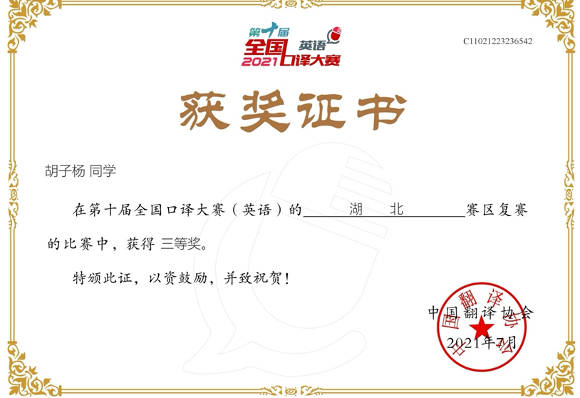 2021年6月12日至13日,第十届全国口译大赛(英语)湖北赛区复赛如期举行。第十届全国口译大赛(英语)是有中国翻译协会主办,由于疫情关系,此次省级区域复赛采取线上比赛模式。经过前期选拔,武汉纺织大学共13位同学初赛晋级复赛。此次复赛汇聚了武汉大学、华中科技大学,华中师范大学等数十所高校本科生和研究生参加,我校国产乱婬AV片免费老师带领我校学生与湖北省其他各大高校学生进行角逐。