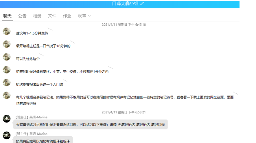 赛前,在黄雪岚和曹婷老师的组织下,建立了口译备赛小组群,大家积极分享自己的口译学习和备赛经验,交流提升口译能力,大家积极参加曹婷老师的线上口译课程训练,进行了大量的口译练习。