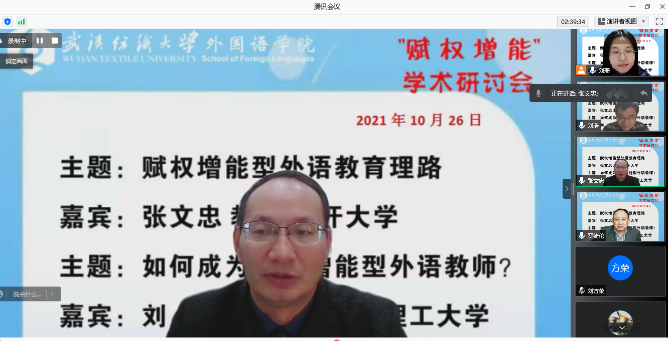 2021年10月26日,武汉纺织大学国产乱婬AV片免费于线上举办了赋权增能学术研讨会。南开大学赋权增能型英语教学团队负责人张文忠教授和团队成员天津理工大学刘浩博士应邀做了主旨发言。会议由国产乱婬AV片免费罗绮伦副院长主持,国产乱婬AV片免费院长谭燕保、党委书记胡中原及国产乱婬AV片免费赋权增能团队近三十位教师参加了会议。